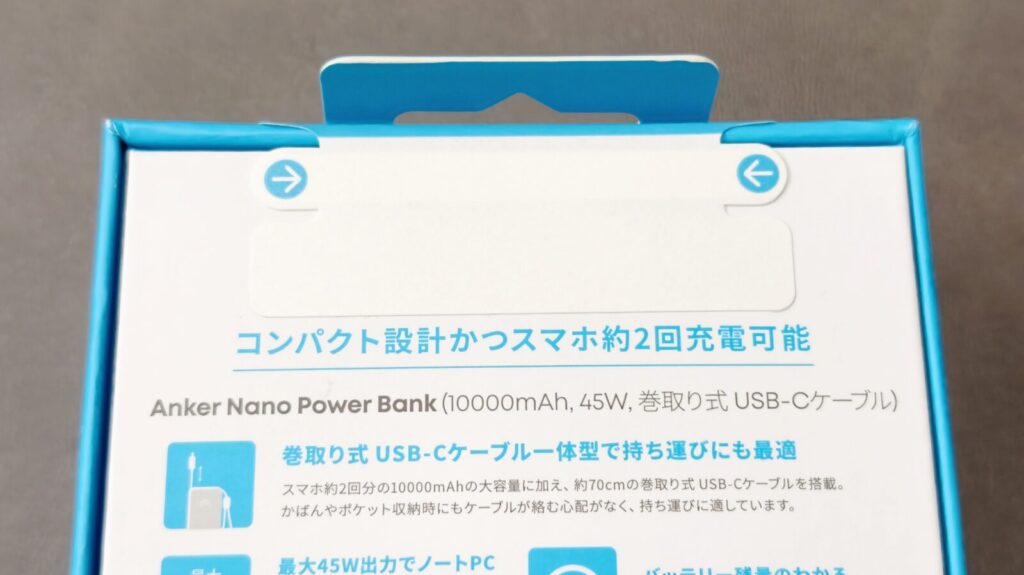 | 製品名 | Anker Nano Power Bank (10000mAh, 45W, 巻取り式 USB-Cケーブル) |