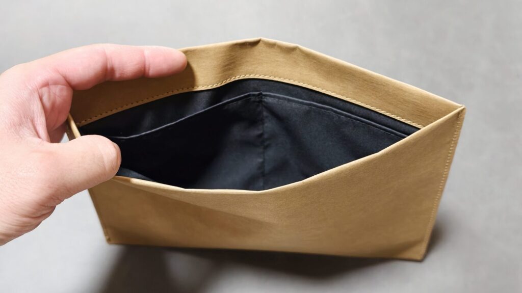 内部には滑らかなポリエステル製の裏地が施され、書類の出し入れに一切のストレスを感じさせません。紙素材特有の「引っかかり」を懸念する必要は皆無です。さらに、気の利いた内ポケットの存在が心強い。不意に名刺入れを忘れた際や、受け取った領収書の整理など、マルチな収納力を発揮します。これ一つ抱えて会議へ向かう――。そんな「社内移動の相棒」として、これほど頼もしい存在はありません。