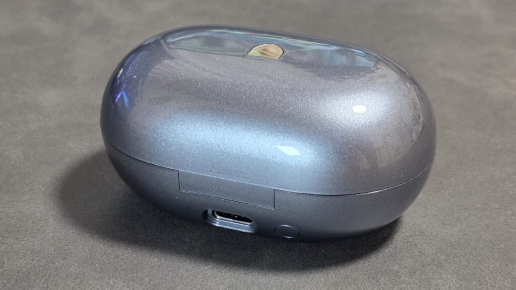 充電ケースは「ダークグレー」という公称色よりも、光沢感とラメ加工が際立つ「メタリックグレー」に近い質感です。天面には、ローズゴールドのブランドロゴが華やかなアクセントを添えています。