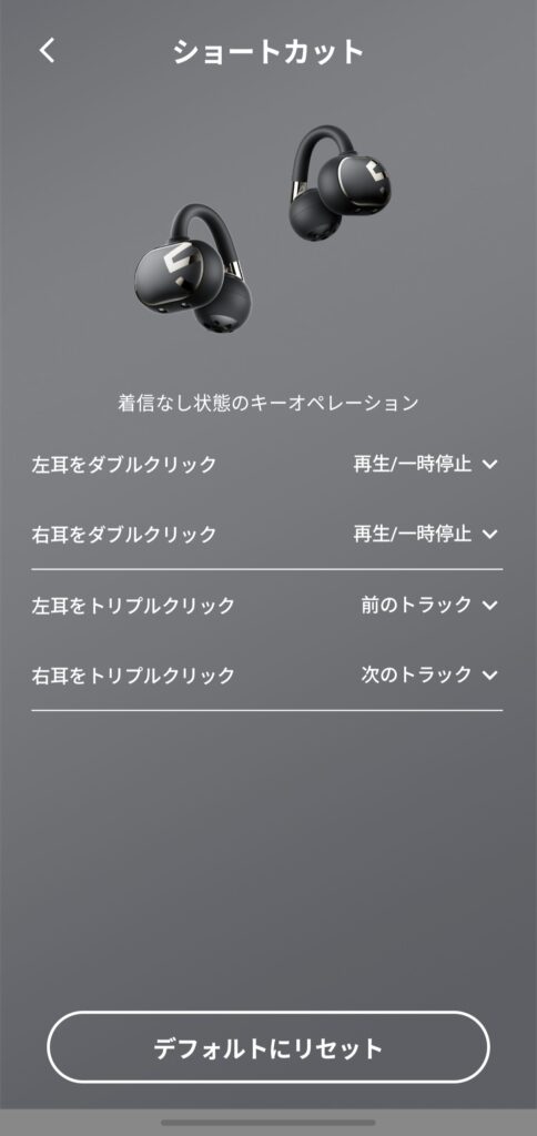 本機はタッチコントロール機能を搭載しており、そのキー割り当てをアプリ上で自由にカスタマイズできます。左右それぞれに2種類の操作を割り当てることができ、音量調整や音声アシスタントの呼び出しなどを即座に実行可能です。