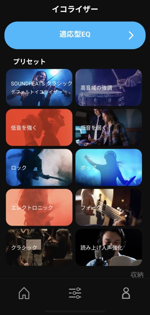イコライザー設定を自由に変更できます。豊富なプリセットイコライザーから選択できるほか、自分好みに音質を調整できるカスタムイコライザーや適応型イコライザーも利用可能です。