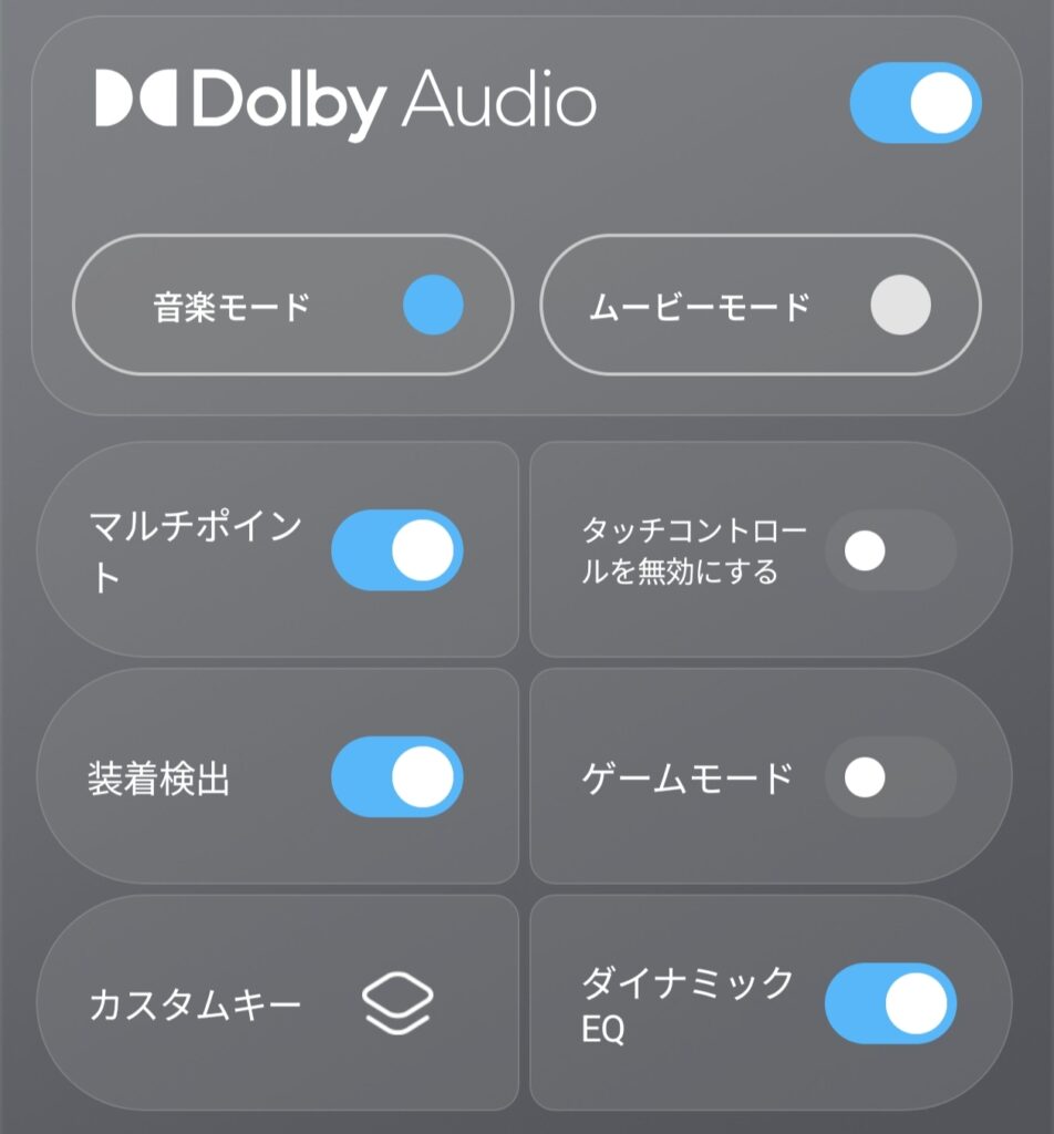 アプリからDolby Audioモードの起動が可能です。オンにすると音場が劇的に広がり、映画館のような立体音響を体感できます。このDolby Audioにも「音楽モード」と「ムービーモード」が存在し、シーンに合わせて設定が可能です。