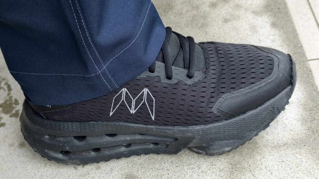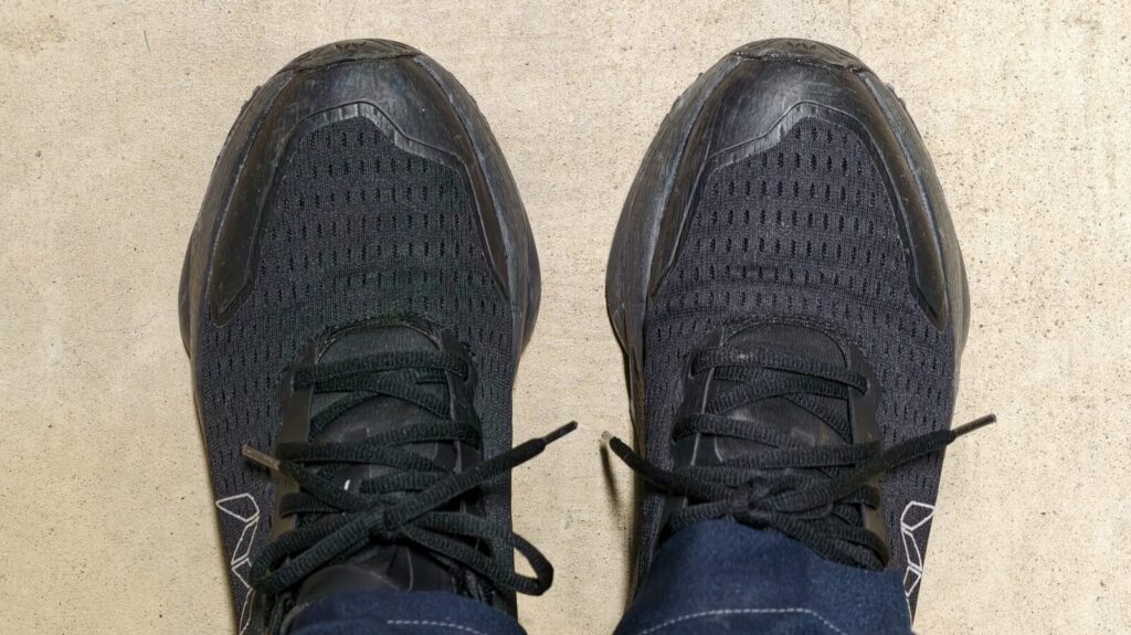 最大のメリットは、分厚いミッドソール(靴底のスポンジ部分)による衝撃吸収力です。