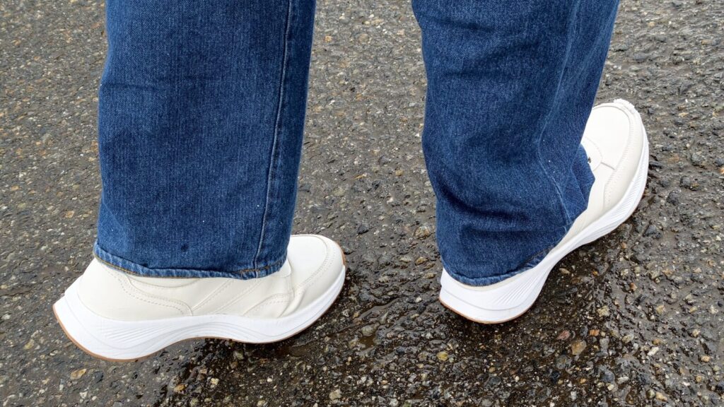 靴紐を結び直さなくてもスルッと履ける脱ぎ履きのしやすさが最高です 。「ラウンドソール」というつま先と踵が反り上がった形状のおかげで、カカトから着地してつま先で蹴り出す動作が驚くほどスムーズ。クッションも柔らかく、長時間のショッピングや散歩でも足裏が痛くなりません。合皮なので多少の雨なら弾いてくれるのも、ワークマン靴との良い使い分けになっています。