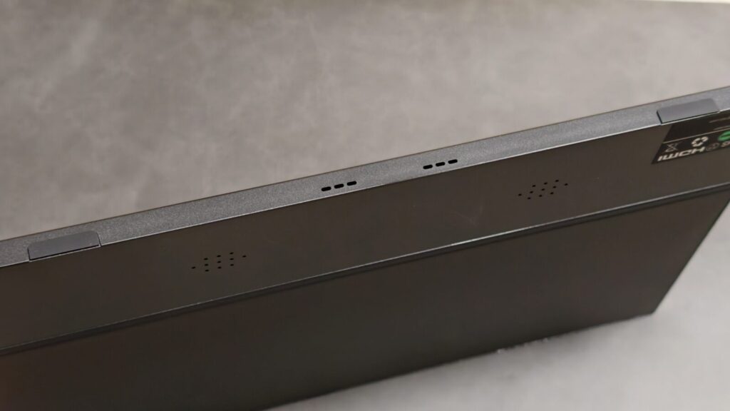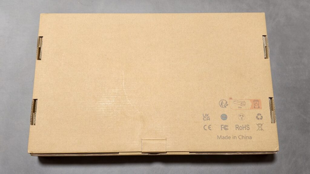 また、Amazonの商品ページではモニター下部にメーカーロゴが確認できましたが、実際に届いた製品にはロゴが一切ありませんでした。ブランド名の主張がなく、よりミニマルな外観となっています。
