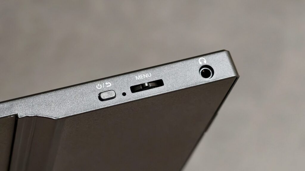 ディスプレイに向かって左側には、電源ボタン、状態を示すLEDインジケーター、メニュー操作用のスクロールホイール、そして3.5mmオーディオ出力端子が備わっています。