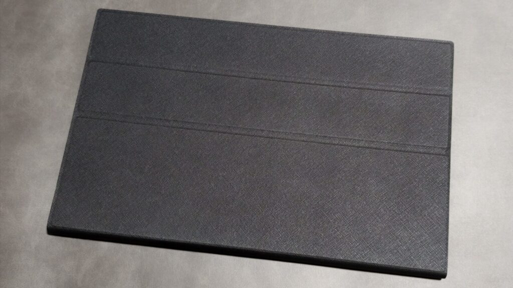 スタンド機能を使用する際はモニターをカバー内側の溝に合わせて立てかける必要があるのですが、カバーの内側やモニター下部が滑りにくい素材になっているため、実際はこの溝に合わせる必要はなく、自分好みの角度で「無段階調整」が可能でした。