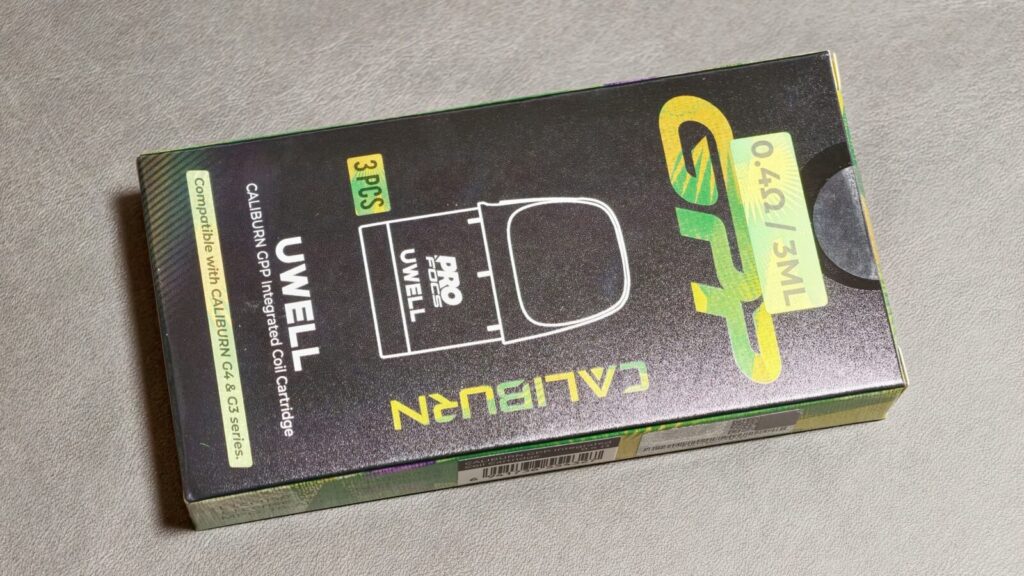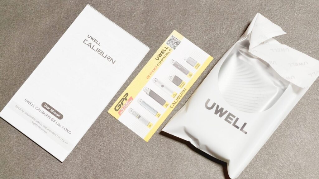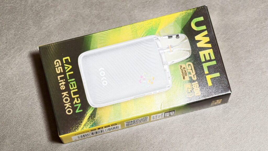 【Uwell Caliburn G5 Lite KOKO】のパッケージは製品の写真を前面に表示した、よくあるPod型VAPEのデザインです。